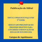 EDITAL CPOS/GEO/CPAQ/UFMS Nº 8/2026- RESULTADO PRELIMINAR DO PROCESSO SELETIVO PARA CONCESSÃO E RENOVAÇÃO DE BOLSAS DE ESTUDOS 2026